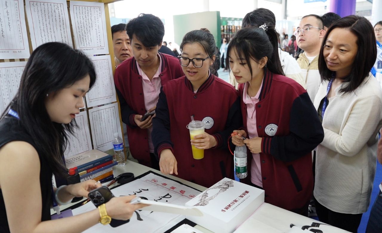 展会现场,为使“满语文”非遗展效果更佳,该项目代表性传承人刘厚生教授展示了教研新成果——满汉文读写卡片。女真文、满文多种书法作品深受参观者喜爱。我校满语文专业师生吕萍、张楚南、葛晓妍、关晟龙进行活态传承,通过现场书写满文条幅及图书签名,手把手教写满文,展示了濒危文字的魅力,科普了满族文化。本次参展首届东北图书博览会,体现了我校“满语文”特色学科建设,是对非物质文化遗产保护传承的又一成果。